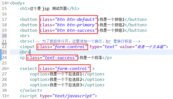 Class= 代表是要使用一个 css 的类,后面的 btn btn-default 或 form-controll 或 text-success 是bootstrap 的样式。